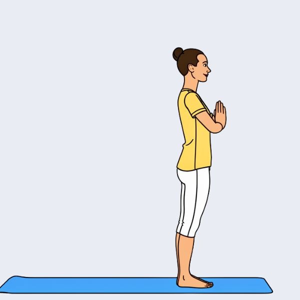Stand erect with the feet together and the body relaxed but upright. Exhale and bring the palms together in front of the chest. This is Prayer Position and establishes a sense of steadiness, calm, and inner centering.