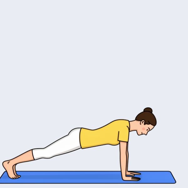 Retain the breath and bring the other leg back beside the first. The body forms one straight line, supported by hands and toes. The head, neck, back, hips, and legs stay aligned.