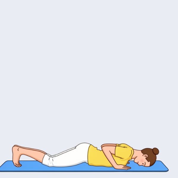 Exhale and lower the knees, chest, and forehead to the floor while keeping the hips raised. This unusual position develops strength in the shoulders, arms, and chest and prepares the transition into Cobra.